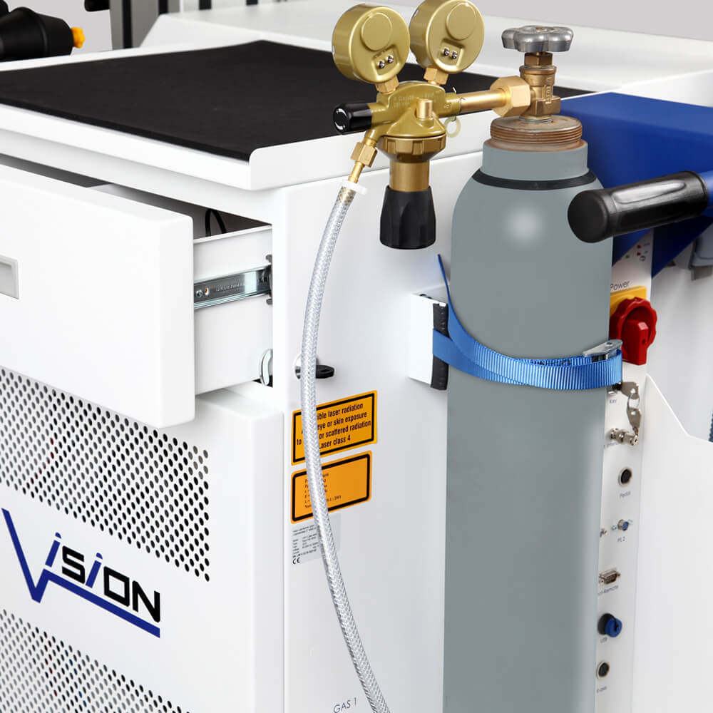 READY TO WORK WHERE, WHEN AND HOW YOU NEED: In other words: highly mobile, extremely flexible and everything on board ready to go at a moments notice. This was the desire of many of our customers, which we adopted entirely as an ambitious challenge. As in the workshop, everything was to be connected and immediately ready for use. Also, tools and working materials should be complete and ready to hand. This also meant that shielding gas and suction would have to be fixedly attached to the mobile device. The term “mobility” was also to be redefined and largely exceed the transport rollers which had been used so far. In addition to the newly defined rollers with jacking option, easy transport by forklift truck, pallet truck or even by crane were on the requirement list. Nothing was abandoned or dropped for financial reasons: the new ToolRoom was to meet all requirements and leave nothing to be desired. The first outlines already showed that with the ToolRoom we were to create something new which was to meet the requirements of the market exactly. The pilot production was already sold before the first laser was mounted. Available as 150W, 300W and 450W FSS laser.