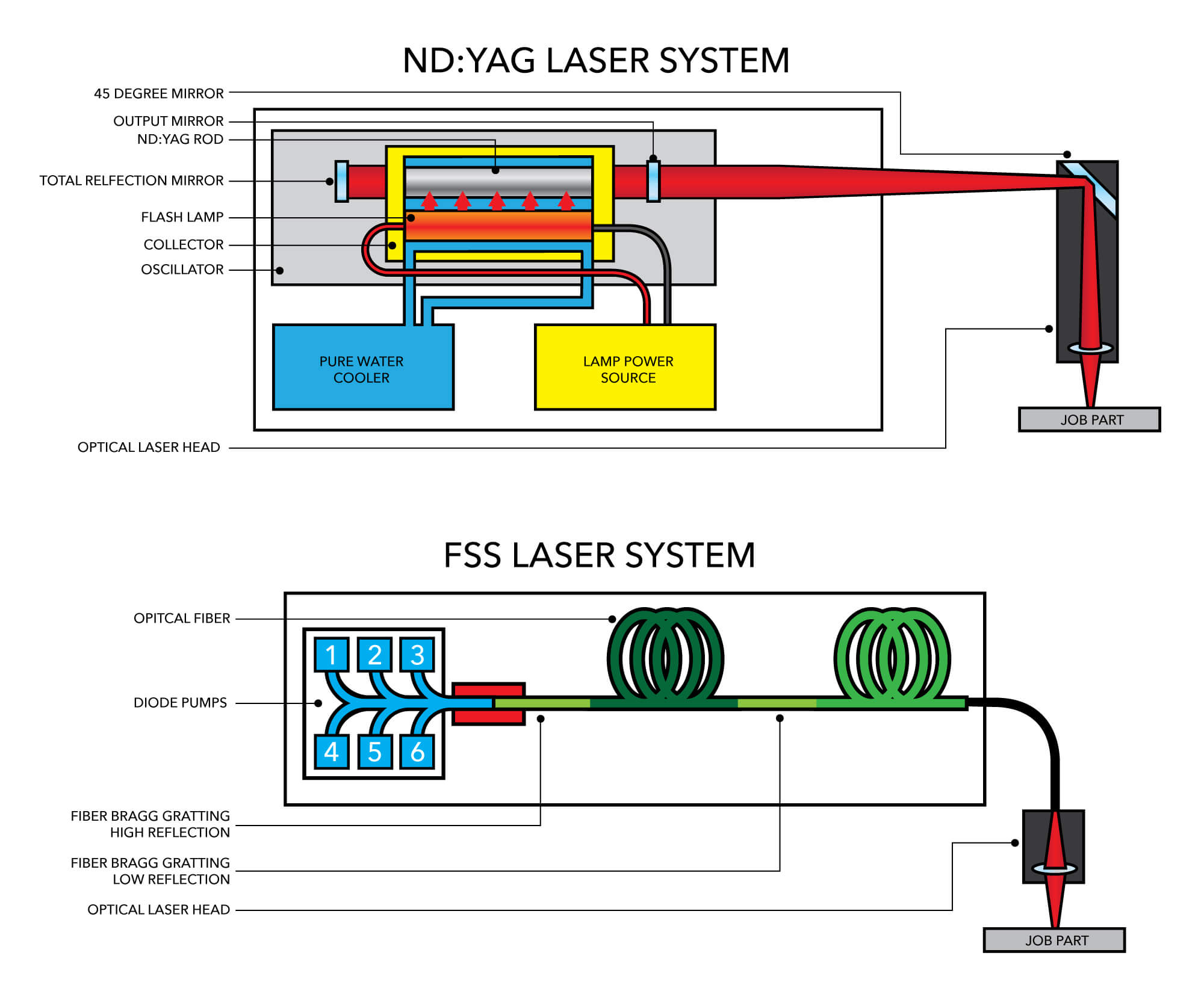Cooling. A Nd:YAG system uses laser crystals, electricity and a xenon flash lamp to create the beam. This process generates a large amount of heat within the machine, which requires a large external cooling unit to maintain proper machine temperature and performance. The chiller takes in the heat and releases it away from the machine and into the surrounding area, which can increase the temperature of the shop if done over sustained periods of time. The chiller also consumes significant amounts of electricity to keep the water temperature stable. Because diodes power FSS lasers in a specific wavelength that can be directly translated into laser light, they produce less extraneous heat. For example, to create 300 watts of laser power from a FSS machine requires 1 kilowatt of electricity, producing 700 watts of ambient heat that a small fan can remove. Creating the same wattage of laser power from a Nd:YAG machine requires 10 times the amount of electricity, resulting in 9700 watts of residual heat that can only be cooled with an external chiller.